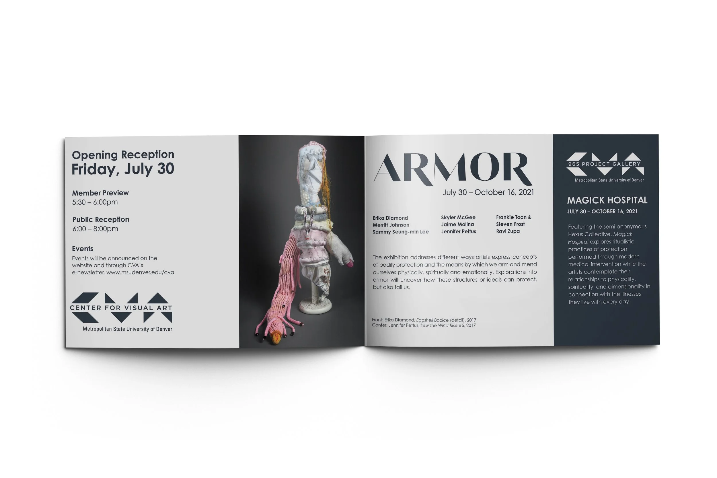 Curated by the CVA’s Director, Cecily Cullen, the Armor Exhibition addresses the many different interpretations of armor one uses to mend and protect themselves physically, spiritually, and emotionally. Immediately, I was intrigued by Erika Diamond’s Eggshell works. I was enthralled with the fragility and strength each work brings, as well as Diamond’s level of skill and craftsmanship. Through this fascination, the design was born. For me, Armor insinuates various layers of protection that we as individuals choose to break down for others dependent on trust. Diamond’s eggshell work translated this concept best and provided a compelling texture to help draw the viewer in.