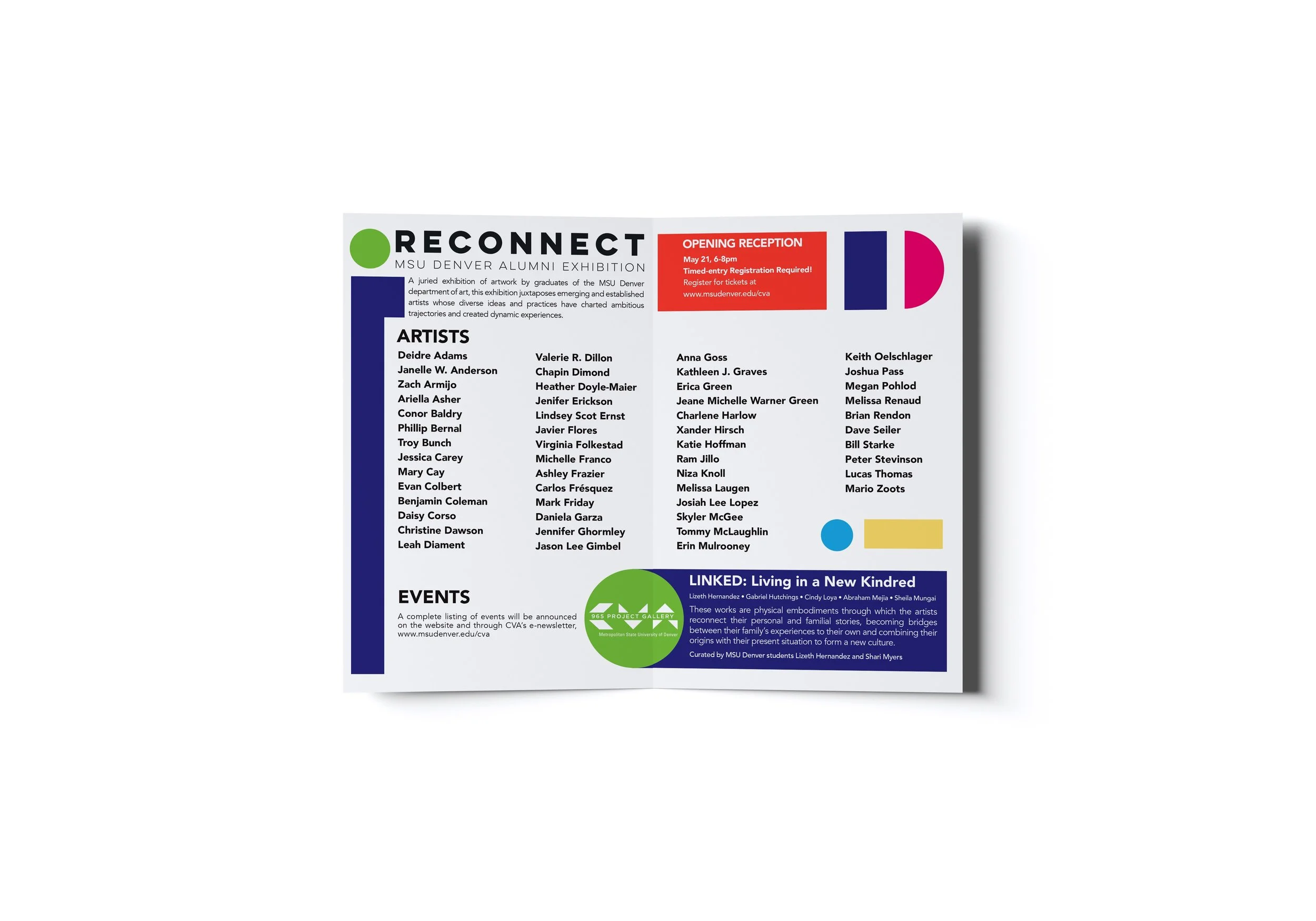 The intent of the design was to show a geometric and spirited interpretation of a MSU Denver’s graduates education and career “road map.” Upon graduation at MSU Denver, each of the alumni leaves the community they have been a part of for many years only to become a part of another community. The Center for Visual Art serves as a hub for reconnection and networking between the public and MSU Denver alumni. The show was juried by Carlos Fresquéz, Zoe Larkins and Natascha Seideneck. This exhibition featured work from over 50 MSU Denver graduates, all who have established themselves as an artist.
